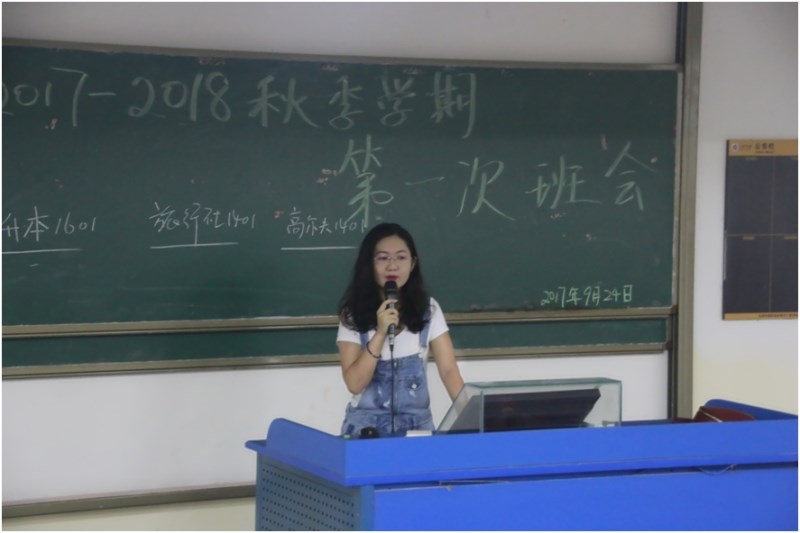 24日19时30分,思想导师李湘婷于2108教室主持2018秋季安排第一次班会,本次会议有我院专升本1601、旅行社1401和高尔夫1401班全体同学到场参与。李湘婷老师在会议上除强调内容包括学生在校行为准则,强调校规校纪之外,还格外强调毕业实习的安排,实习报告的要求,以及最后一年需要准备和参加的演讲、招聘会等事宜。时刻保持对自己的严要求,保持自己的求学、好学之心,认真完成最后一年的学习内容。