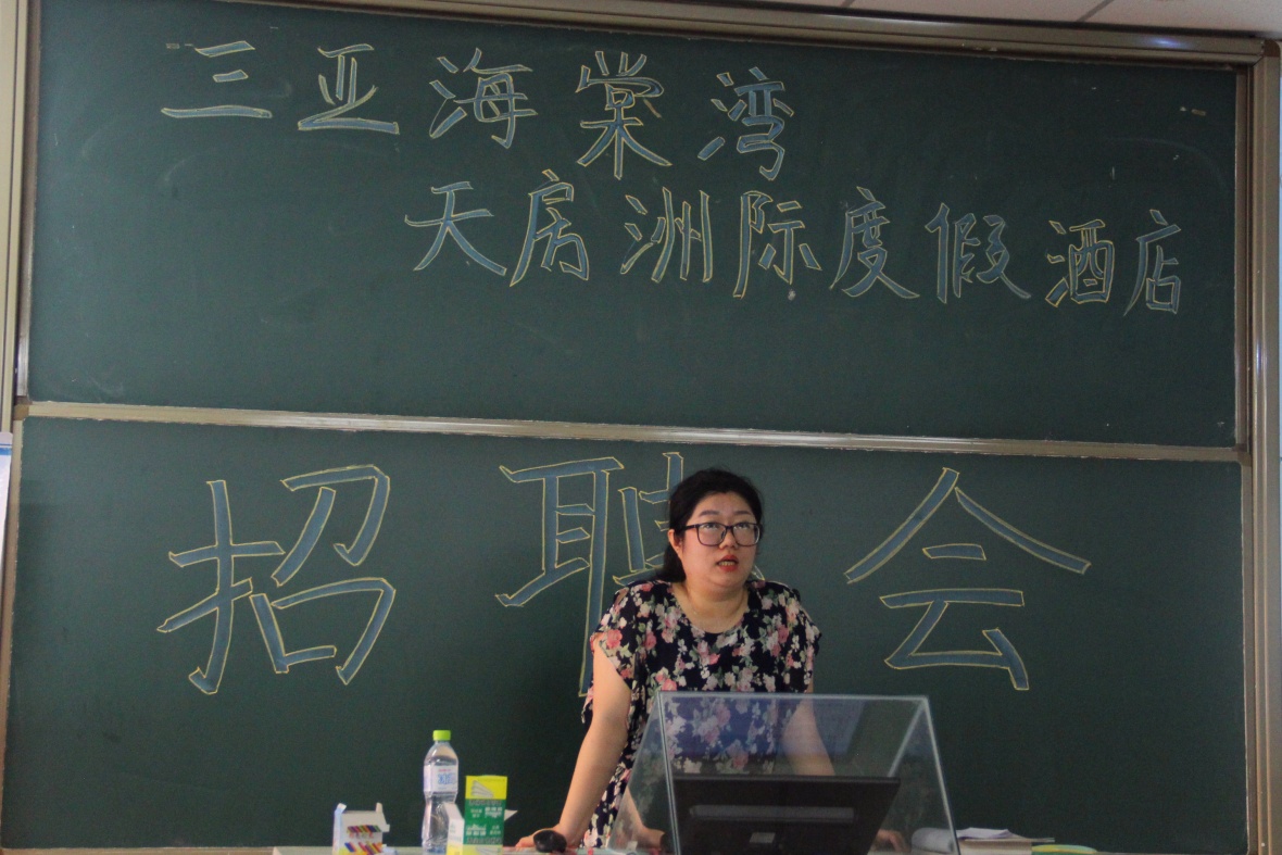 11月15日下午16时30分,我院于书知楼2202教室开展三亚海棠湾天房洲际度假酒店招聘会,出席此次招聘会的有天房洲际度假酒店人力资源经理杨婷婷女士、招聘主管陈浩俊先生以及前来应聘的18届学生。会议由杨婷婷经理作为主讲人,为在场学生进行企业宣讲。