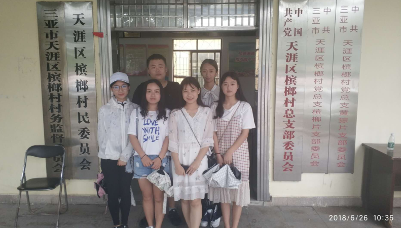 9月10日,我院思想导师石玲老师及7名学生组成“暑期三下乡槟榔村调研队”在三亚市天涯区槟榔村开展了为期6天的“三下乡”社会实践活动。本次活动其目的是全面了解槟榔村,实现槟榔村在电子商务技术方面的广泛应用,帮助槟榔村利用电子商务支持农产品产销对接,以“三亚槟榔村民生调查”为活动主题,实践项目为共同富裕。