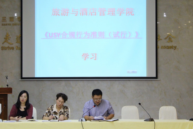 10月31日下午3时,旅酒学院在白鹭苑东湖厅《USY合规行为准则(试行)》文件学习会议。会议由执行院长柴勇主持,院长杨玉英,副院长郜宣,党总支副书记王翔,党总支副书记牟晅,院长助理李昭及全体老师共同参与此次学习。