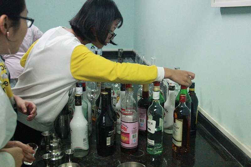 介绍完毕,龚慧老师组织学生分小组进行实验,并加以指导。短短的课程,龚慧老师将学生带入饮品的世界,从历史背景至调料配方,深刻领略各项饮品的魅力。