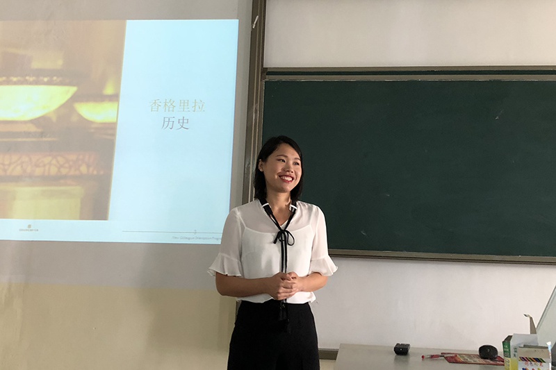 唐经理在介绍海口香格里拉大酒店之前引入如何理解香格里拉的问题,在场学生纷纷表达自己的看法。接着以视频方式让学生直观感受其酒店的魅力,明晰香格里拉酒店集团的发展历程、分布地区以及其集团的文化和宗旨,短暂的视频让学生耳目一新,也留下深刻印象。之后从地理位置、外观、贵宾楼、大宴会厅、香宫、客房等方面介绍其酒店,最为突出介绍的是香宫及“气”水疗。