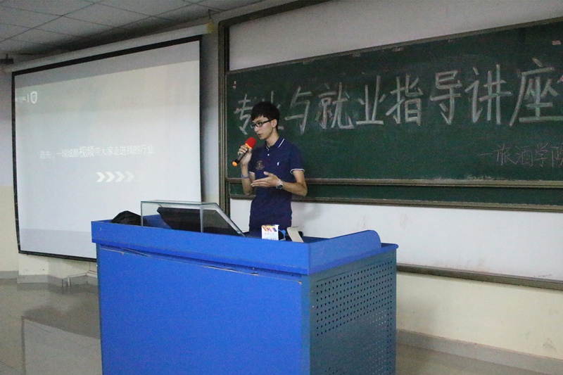 首先,刘蕴钊作自我简介,并以一段会展活动视频简介他目前的就业单位——快思图商务会展公司,此公司于2014年1月正式成立,致力于会议活动策略咨询与策划、公关活动的组织策划、大型线下推广策划和执行工作,并于海南、广州、昆明、北京、上海、西双版纳、南宁成立区域中心。随后,刘蕴钊直击主题,为在座学生从会展、酒店、国旅、旅行社等专业细分未来就业岗位,评析各岗位的优劣、需求与专业匹配度。