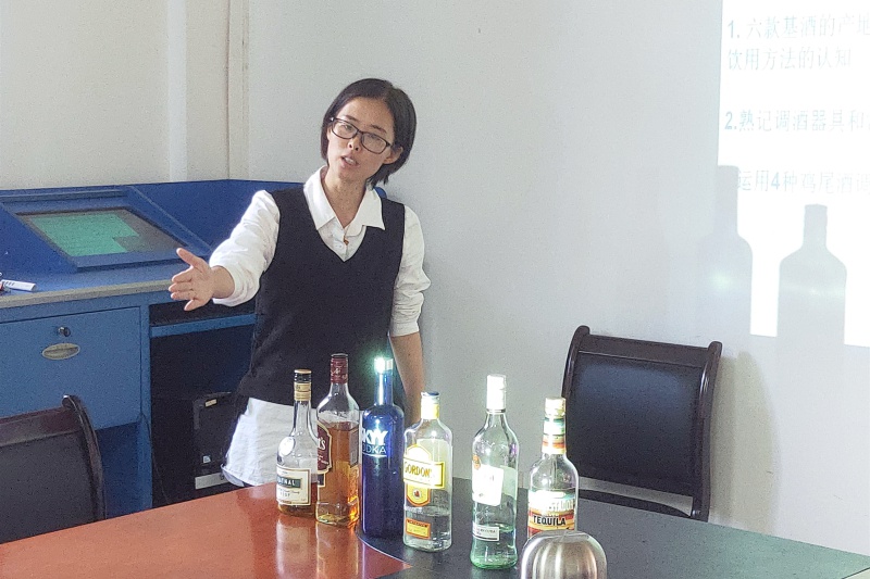 实践方面的讲解由王婕霏老师开始,她带领大家回顾理论知识后开始实际操作,主要演示了碧螺春、雀舌、太平猴魁三种茶的投茶法以及泡茶过程。接着是龚慧老师实体介绍基酒、调酒器具以及鸡尾酒的调制方法,在讲解中她还简单提出和解释了有关酒的错误常识,丰富了课外知识。精彩的教学比赛在连续不断的掌声中告一段落。