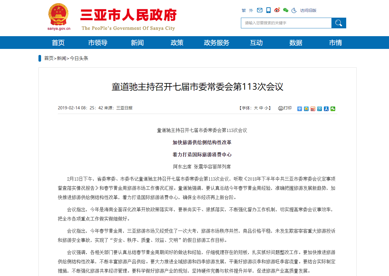 作为三亚市七届市委常委会第113次会议关于《春节黄金周旅游市场工作情况汇报》会议材料相关新闻