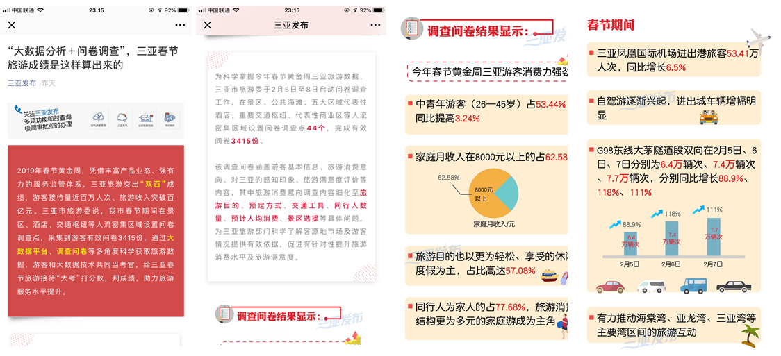 我校旅游与酒店管理学院海南旅游新业态研究中心主任亓元副教授利用寒假带领课题组师生从事三亚市旅游发展委员会委托的横向课题研究,对三亚市2019年春节黄金周旅游市场开展专项调研并形成报告呈交相关政府部门,为地方政府决策使用,相关数据通过三亚市旅游委发布后,得到中共三亚市委宣传部官方微信平台(三亚发布)、三亚市旅游发展委员会官方微信平台(三亚旅游)、地方政府网站、《三亚日报》等政府平台、媒体宣传报道,如三亚发布微信平台文章《“大数据分析+问卷调查”,三亚春节旅游成绩是这样算出来的》、《春节大数据丨三亚旅游市场有什么特点?哪些景点最受欢迎?》等大量使用三亚市旅游发展委员会委托我校该课题组开展的课题研究成果。
