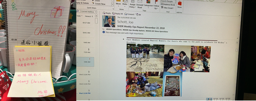 酒店1601班于洪浩在上海迪士尼商品部实习,11月开始策划并组织的商铺活动——礼物传递,并在假期期间正式召开。本次活动首先利用游客的好奇心,商品专员宣讲迪士尼企业文化,由游客自行挑选礼物,描写想传递人的特征,并写上祝福语,由我们商品专员协助寻找,依次类推。最终,获得了圆满成功,为商店带来一定的效益,并登上迪士尼大老板的推文。