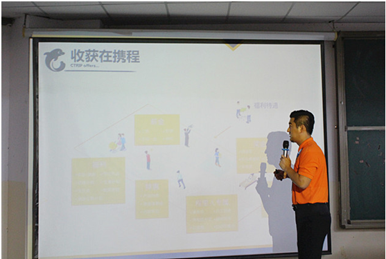 在随后的讲解中,周新宇先生引出了此次的重点——AGT酒店业务培训生。AGT作为携程独有的一种招聘文化,通过选拔特定的人才进行培训,为携程这个大家庭提供源源不断的新生命和创造力。周新宇先生说他希望有梦想爱学习并有实力的人可以加入到他们,学习到更加专业的知识,获得更丰富的经验,结识更多的人,更加开阔自己的视野,成为旅游行业的翘楚。最后,周新宇先生与他的团队对学生们的一些疑惑进行解答,不管是携程这个公司,亦或是整个行业发展前景都进行了详细的回答,帮助学生们更好的思考个人未来的发展。