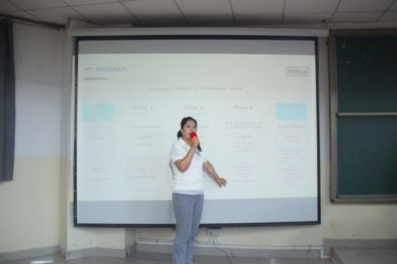 为鼓励学生积极就业、更好地拓宽就业渠道,3月27日下午,我院于书知楼1208教室进行了关于希尔顿大中华区域管培生招聘宣讲会,负责此次宣讲会的是三亚海棠湾康莱德&万达希尔顿逸林度假酒店人力资源总监胡文静、房务经理何静、人力资源部经理杨晗,我院120余名学生参加了此次招聘宣讲会。