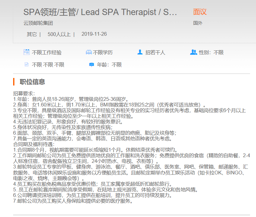 云顶邮轮集团SPA领班