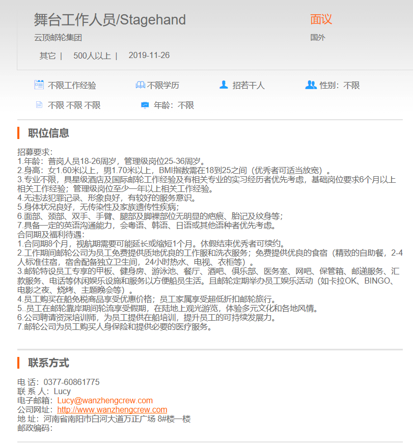 云顶邮轮集团五台工作人员
