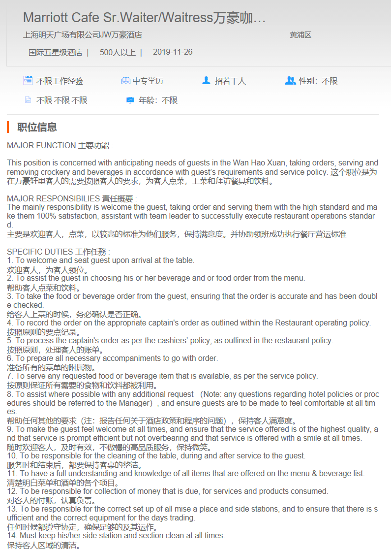 上海明天广场JW万豪酒店咖啡厅资深主管