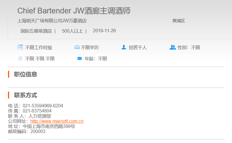 上海明天广场JW万豪酒店JW酒廊主调酒师
