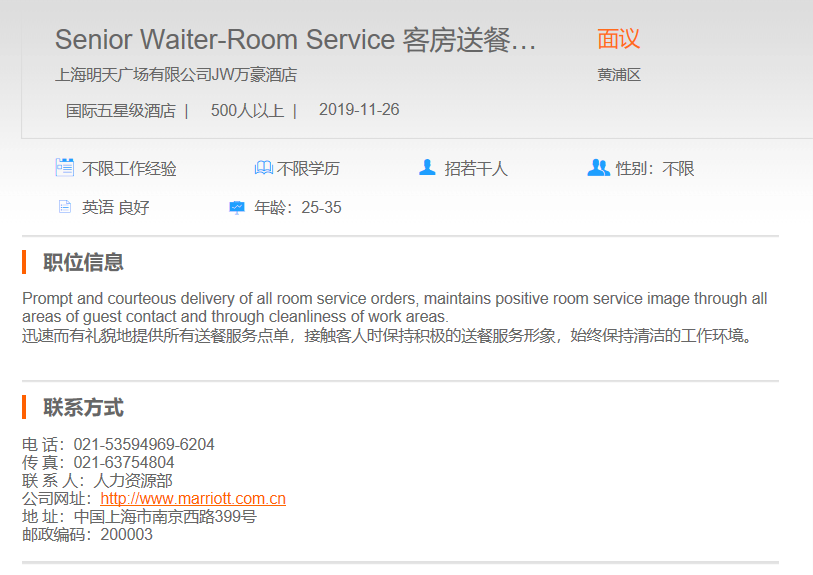 上海明天广场JW万豪酒店客房送餐员