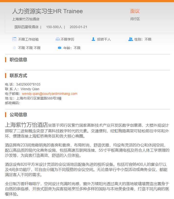 上海紫竹万怡酒店人力资源实习生
