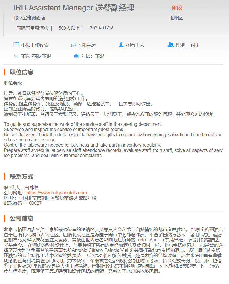北京宝格丽送餐部副经理