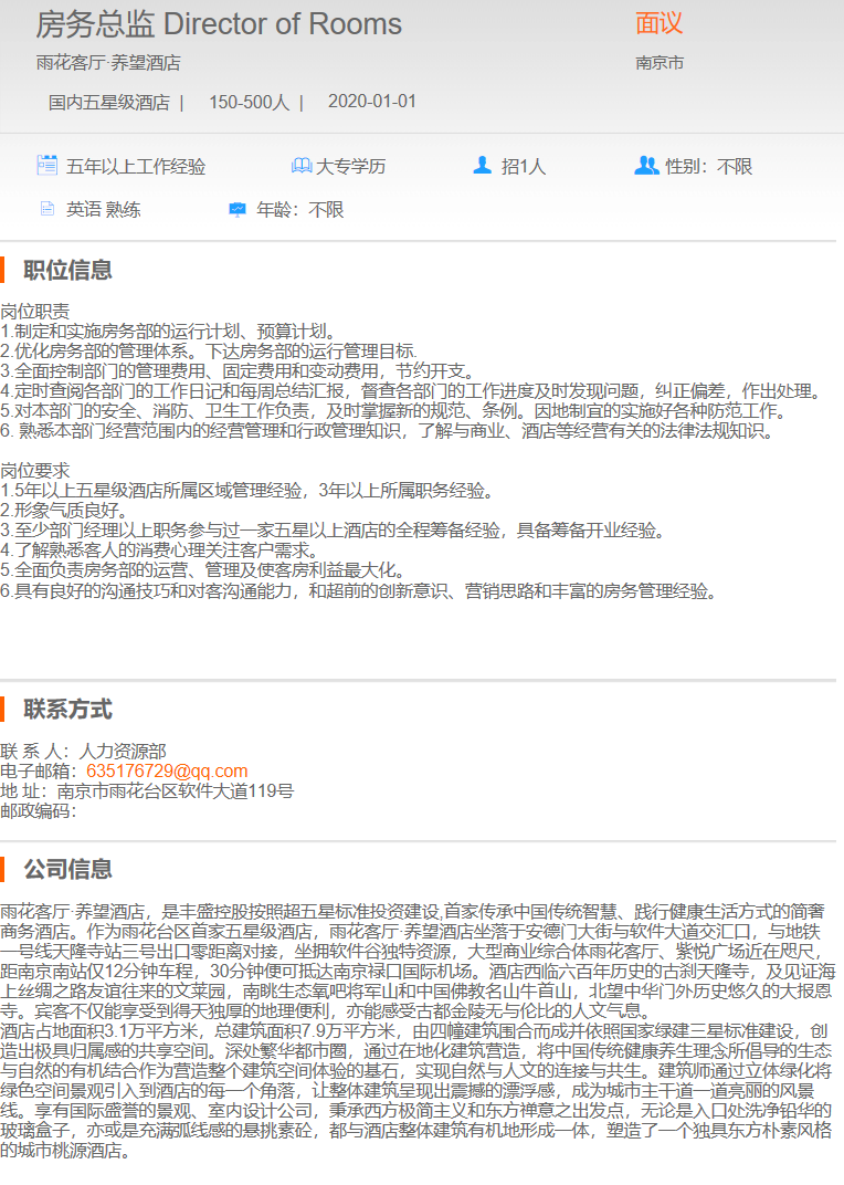 南京雨花客厅 养望酒店 房务总监