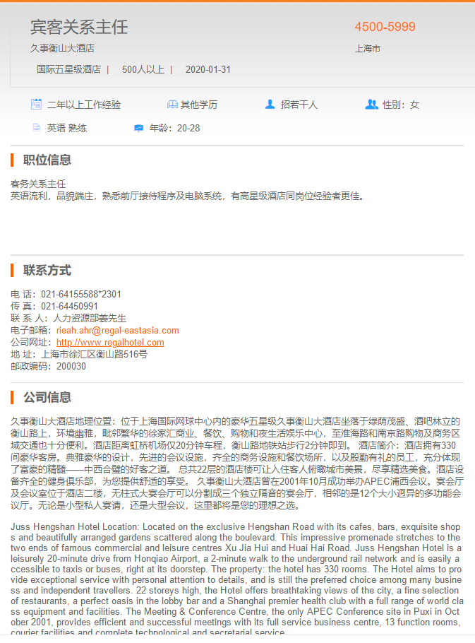 久事衡山大酒店宾客关系主任