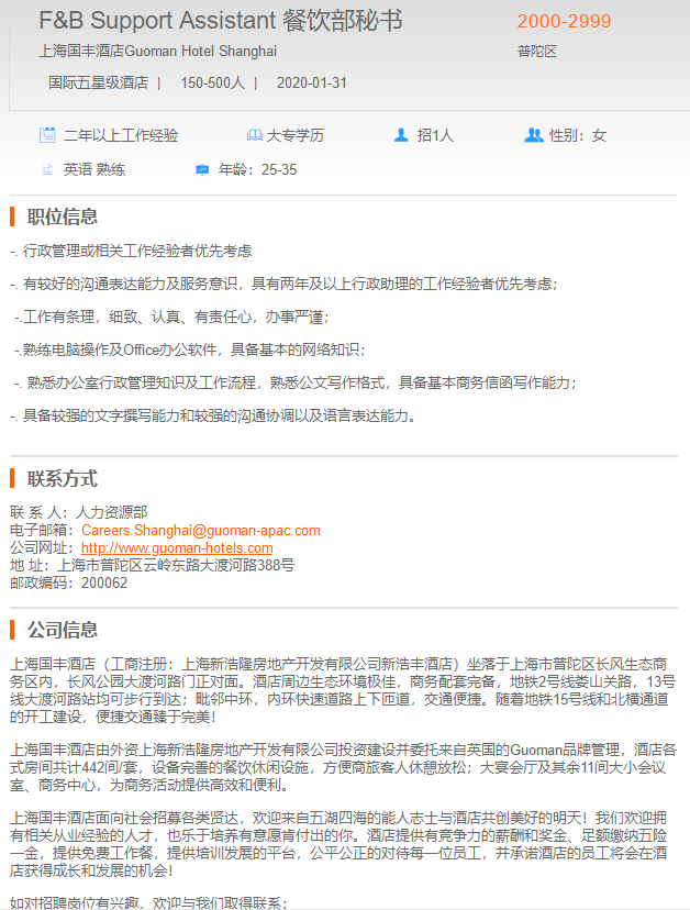 上海国丰酒店餐饮部秘书