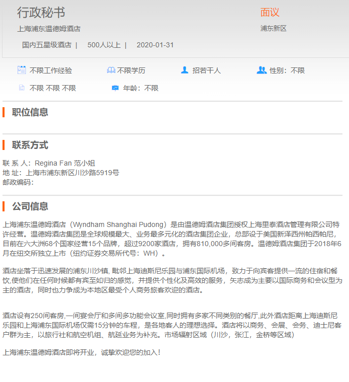 上海浦东温德姆酒店行政秘书