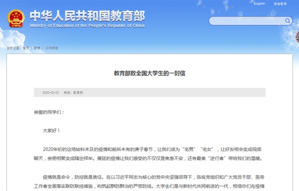 疫情就是命令,防控就是责任。在以习近平同志为核心的党中央坚强领导下,各级党组织和广大党员干部、医务工作者全面落实联防联控措施,构筑起群防群治的严密防线。大学生们是与新时代共同前进的一代,相信你们在疫情防控的斗争面前,一定会肩负起时代赋予的使命与责任,与祖国同命运,与人民共患难,为夺取抗击新型冠状病毒感染肺炎疫情斗争的胜利作出应有的贡献。