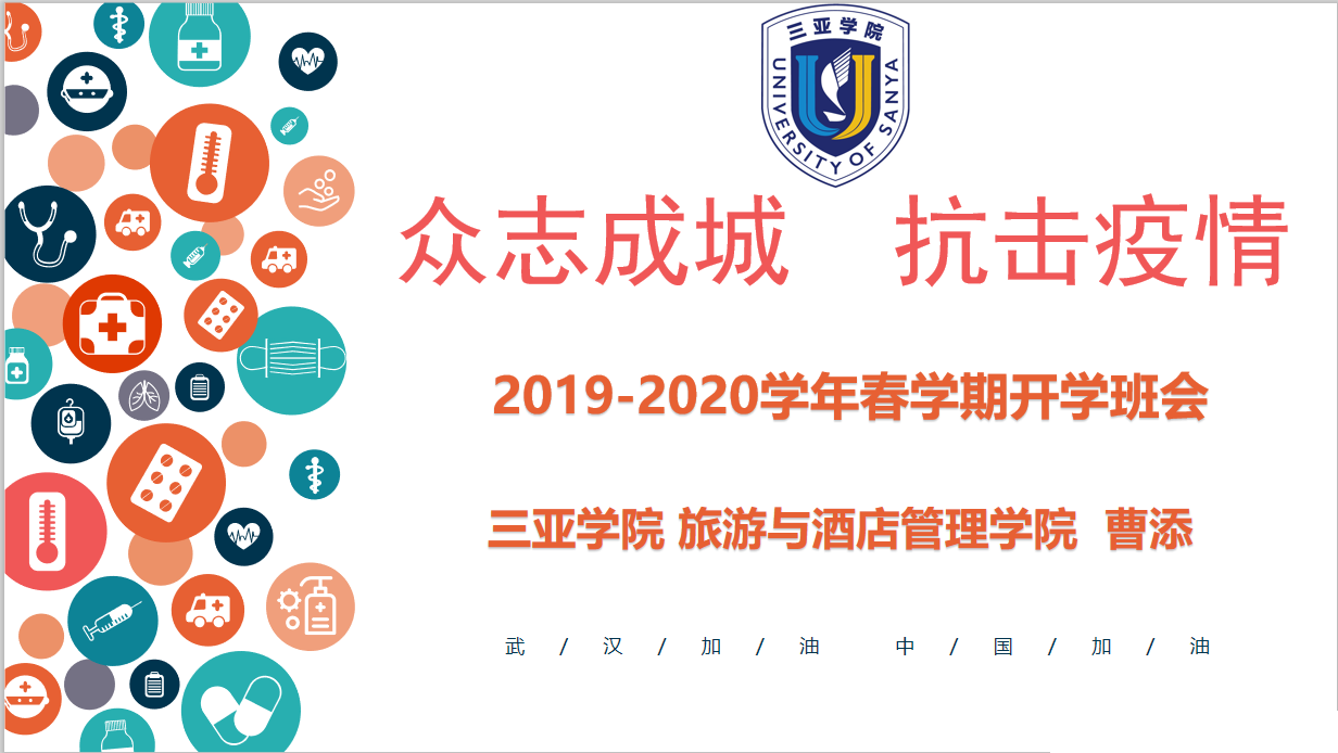 2020年2月23日,我院毕业班思想导师曹添老师组织酒店1601、酒店1602、美高梅1601班级全体同学,召开“众志成城、抗击疫情”2020届毕业生春学期就业工作视频班会。会议中,曹老师首先关于省厅及学校下发延期开学预案、师生返校规定、每日健康信息反馈、海南健康码和返校健康码登记、心理辅导热线及远程访问图书馆电子资源等常规系列工作作以回顾,确保学生做好疫情防护及过渡工作。