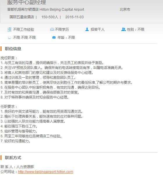 首都机场希尔顿酒店服务中心副经理