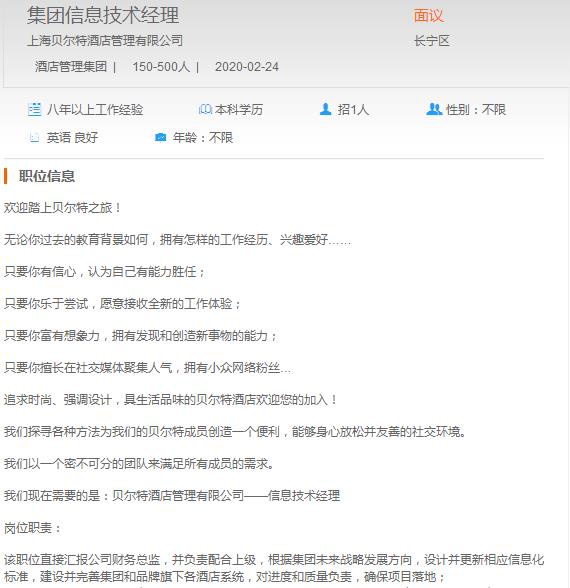 上海贝尔特酒店管理公司集团信息技术经理