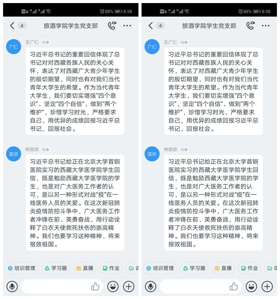 旅酒学院学生党支部于2020年3月16日响应国家教育部的号召———停课不停学,组织旅酒学院学生党员及入党积极分子开展了线上学习《教育部关于学习贯彻习近平总书记给在北京大学首钢医院实习的西藏大学医学院学生重要回信精神的通知》和《习近平总书记给在首钢医院实习的西藏大学医学院学生的回信》活动。