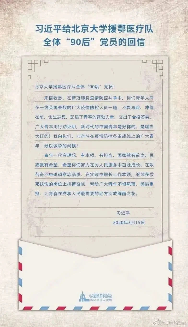 习近平总书记给北京大学援鄂医疗队全体“90后”党员的回信全文