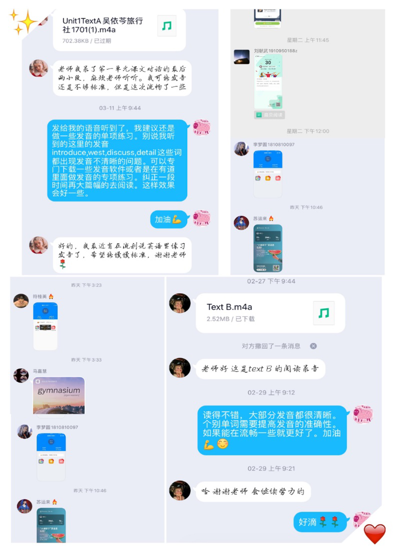 课堂时间的学习是有限的,课下需要更多的跟同学沟通,多鼓励大家才能将英语学习的习惯保持下来。李佳老师提出了“每天坚持一点点,每天进步一点点”的阅读打卡口号,在班级群里带领大家学习打卡并鼓励坚持。为了训练同学们开口说英语,老师推荐大家ABOBOO的跟读APP倡导同学进行RA(Read Aloud)口语训练,同时鼓励大家将阅读的音频发给老师进行指导和交流。