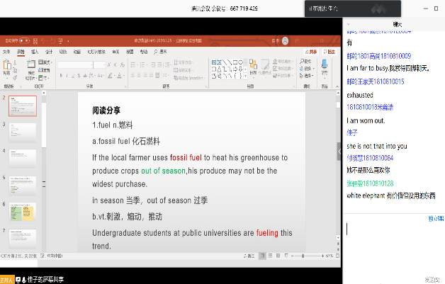 课堂阅读分享、视频学习和学生讨论互动截图