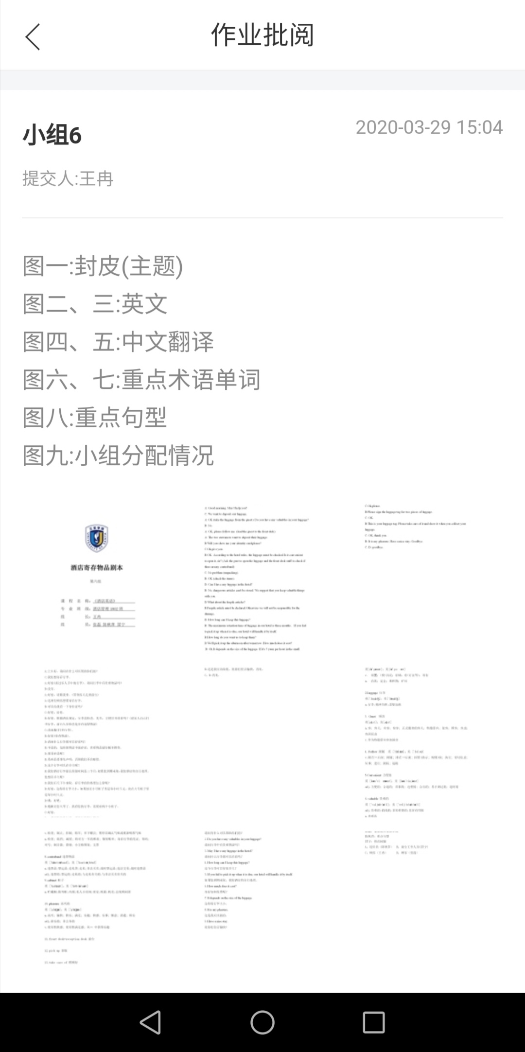 《酒店英语》课程的最后一个阶段是检验课程学习进度和课程掌握程度。耿佳老师通过同学的个人作业、小组情景剧剧本作业、教师评语反馈、阶段性问卷调查等板块设计,真实、客观地反映同学们的学习情况。其中,“个人作业”板块(图7)包括每个章节的重点单词、重点词组、重点句型、朗读,旨在考查同学对理论课知识点和教材知识点的掌握。“小组作业”(图8)的情景剧编写,包括中英文写作、固定搭配,旨在考查同学们对于实践课知识点的应用。“教师评语反馈”在为指出课程学习中存在问题的同时,也给予学习的鼓励,树立同学的学习信心!“阶段性问卷调查”(图9)以月份为一个周期,了解同学们在网络课程学习方面的困难和对教师的课程评价,以便于更好的提升课程《酒店英语》远程SPOC教学的质量。