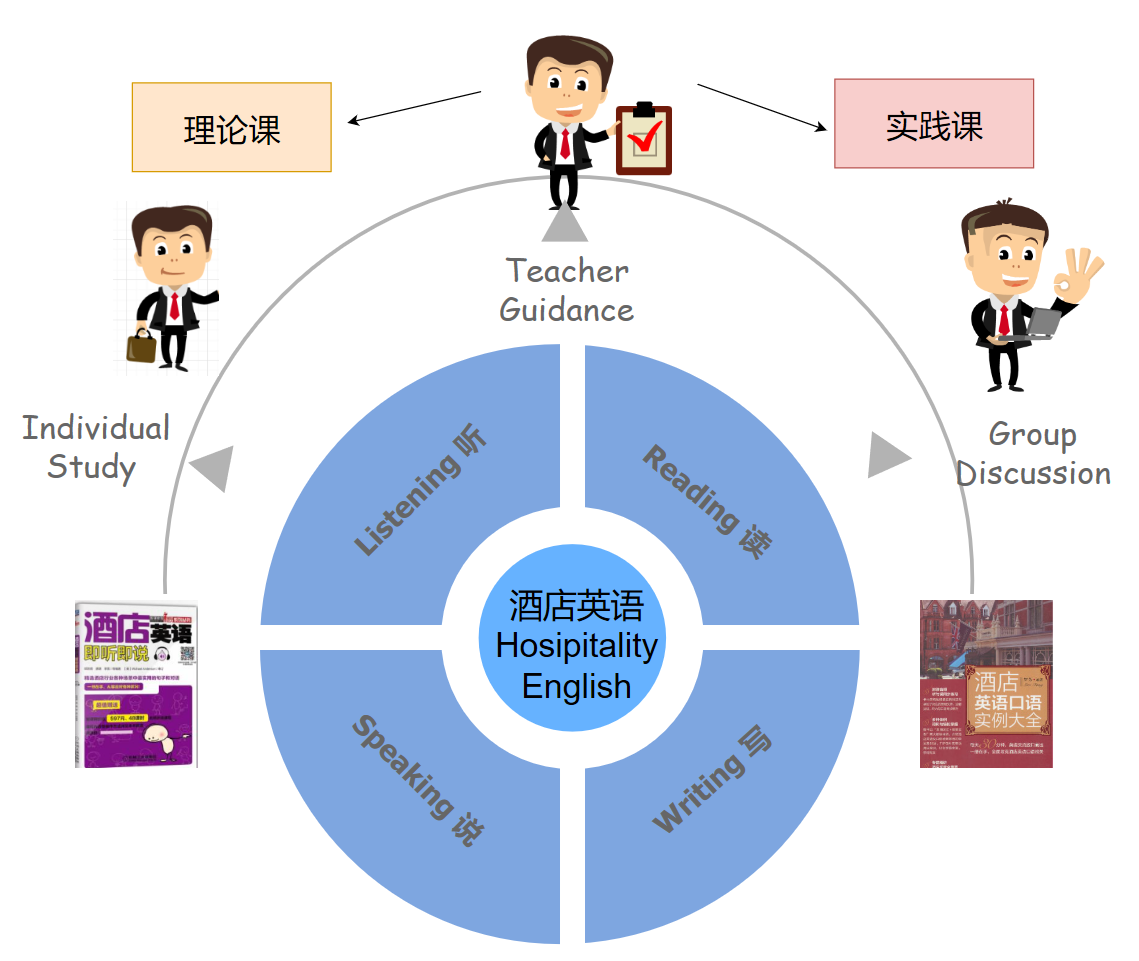 在课程设计的初步阶段,耿佳老师设计了《酒店英语》的四大教学板块,即听Listening、说Speaking、读Reading、写Writing。通过对2018级酒店专业同学的英语水平情况的摸底,了解到同学们对学习口语和写作两个部分的能力比较弱。于是,耿佳老师从两方面重点设计和讲授课程:一方面在课程的理论课程重点教授酒店英语中常用的单词、句型和固定搭配,进而加强写作能力;另一方面,在课程的实践课程重点安排各个小组之间、小组成员之间、老师之间的互动交流,进而提高口语能力。