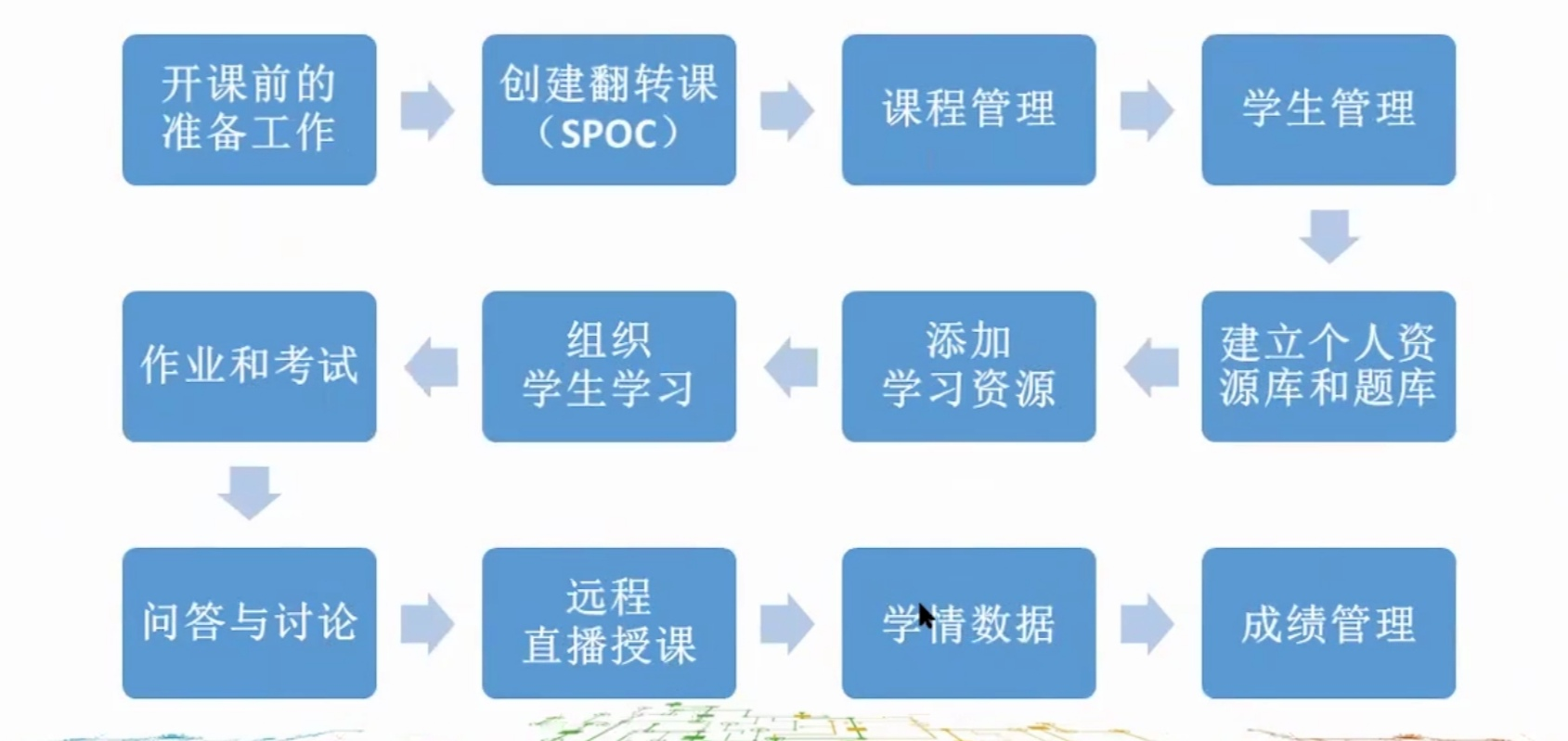 耿佳老师从准备课程资源、创建翻转课、管理学生和课程安排、规划课程作业和考试、组织线下学习和讨论、安排远程直播见面课、追踪学情数据和成绩等12个方面展开了酒店专业课《酒店英语》的远程SPOC教学计划。