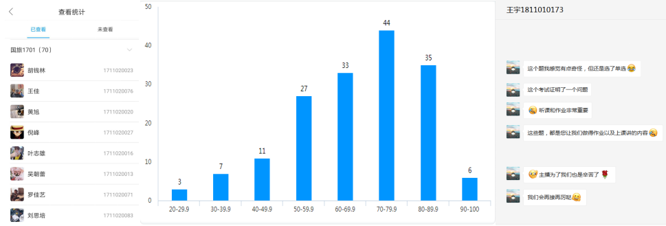 智慧树视频观看统计、线上测试成绩分布与学生反馈