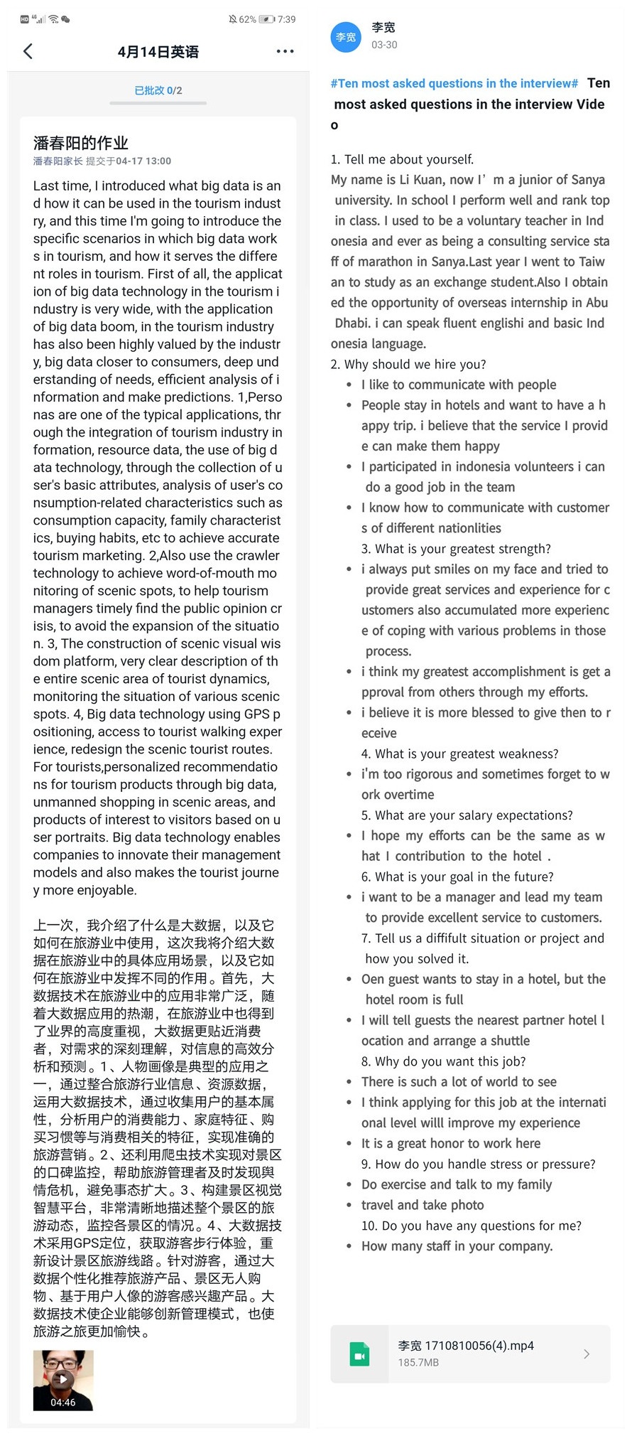 从接到线上授课的任务开始,余燕伶老师就已经开始思考如何在有限的线上授课时间里,既完成授课目的,又积极调动课堂气氛,提高同学们的参与度,实现同学们自主学习能力的提升,达到较好的自主学习效果。结合线上教学的特点,余燕伶老师选择了钉钉作为主要教学平台,通过钉钉可以保存教学直播录像,方便由于网络不畅不能及时加入课堂的同学进行回看,同时同学们还可以通过钉钉界面即时进行会话,完成课程中英文翻译的任务。