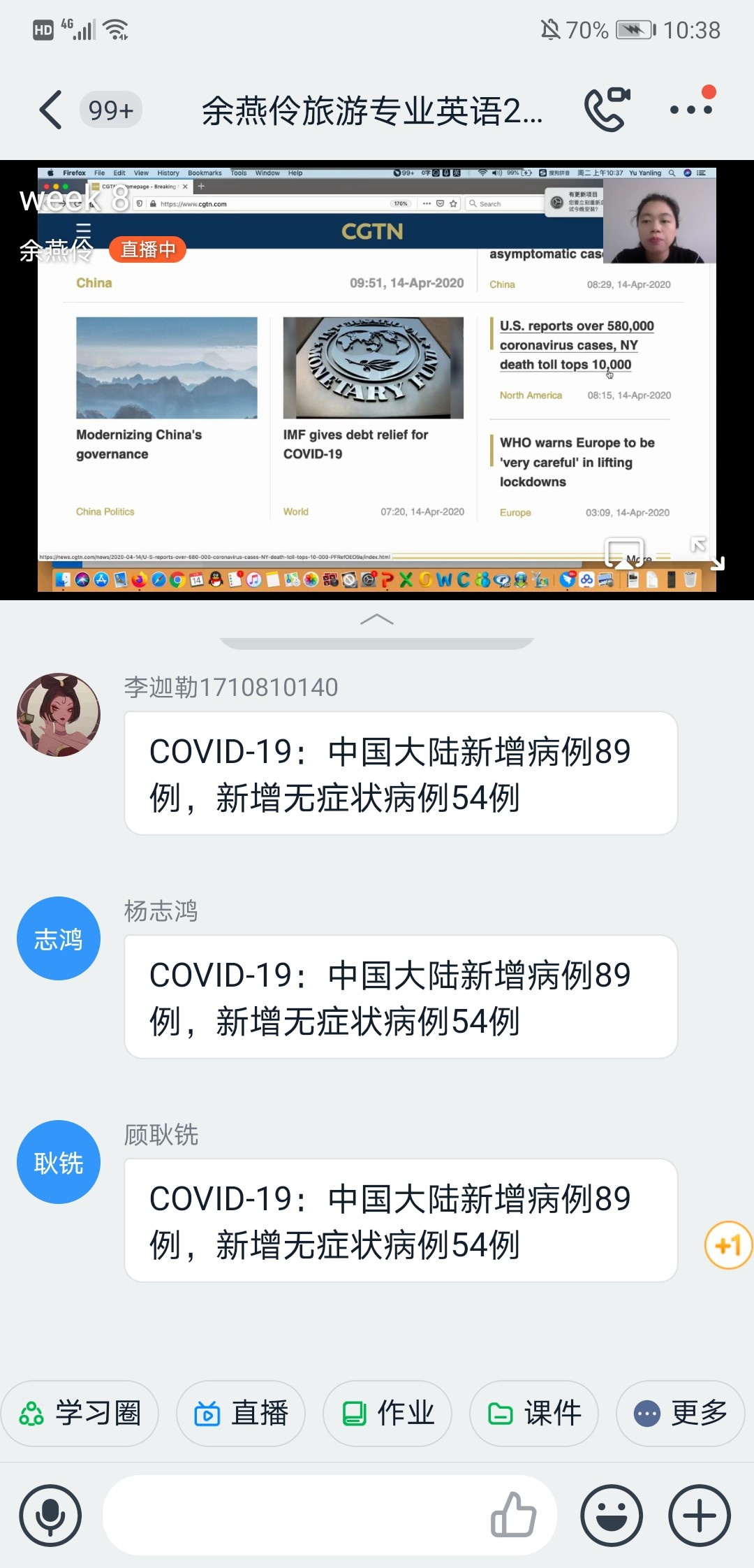 2新闻速览。通过浏览CGTN网站头条新闻,余燕伶老师带领同学们了解国内外发生的大事,并进行英中翻译。毕竟家事国事天下事,同学们都应该事事关心。