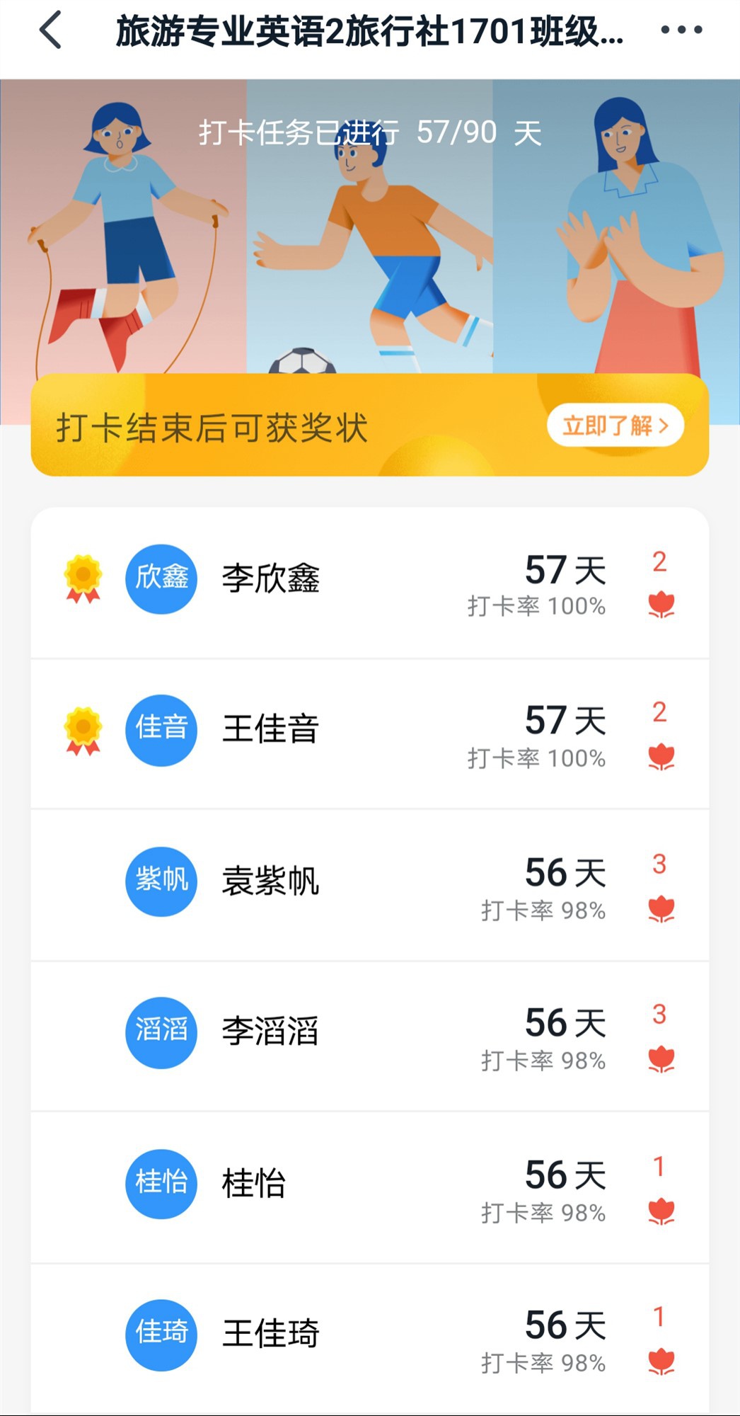 除了上课之外,余燕伶老师还进行了英语打卡任务的发布,通过每日大声说英语打卡任务,督促同学们英语学习的习惯养成。学语言需要积累,犹如滴水穿石,需要日复一日的努力,也为这些榜上有名的同学点赞。