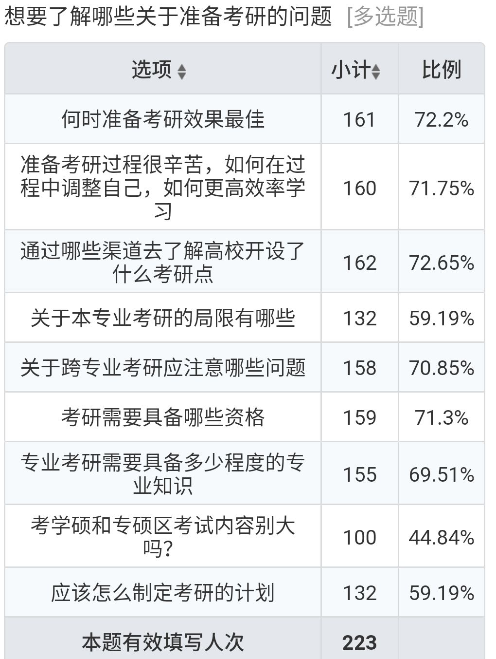 此次抽样调查结果显示,17级参与问卷调查的学生中对于数学科目的学习、复习时间的规划和是否需要报相关培训机构的疑问较为明显。低年级参与问卷调查的223名学生中49名考研意向明确,126名意向模糊,其中学生对通过哪些渠道了解考研信息、如何确立报考院校和怎样合理制定考研计划的问题关注度较高。