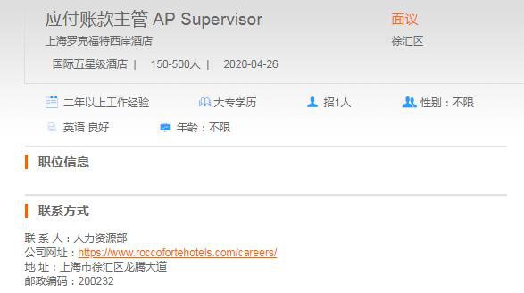 上海罗克福特西岸酒店应付账款主管