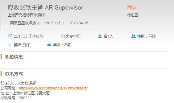 上海罗克福特西岸酒店应收账款主管