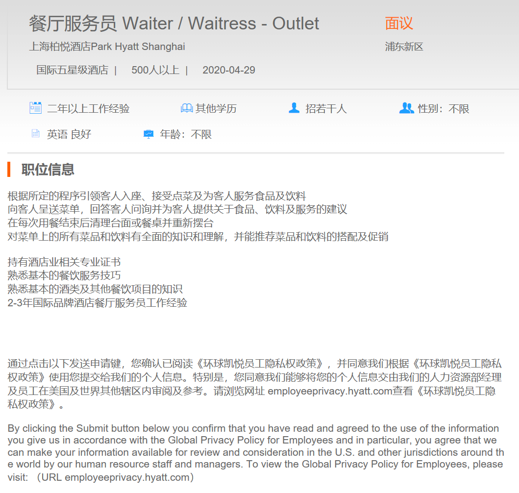 上海柏悦酒店 餐厅服务员