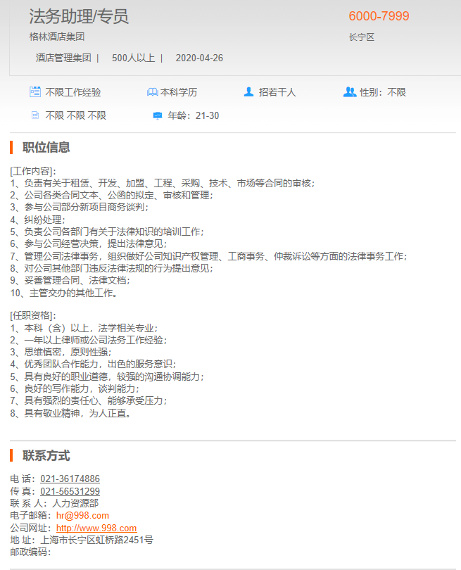 格林酒店法务助理