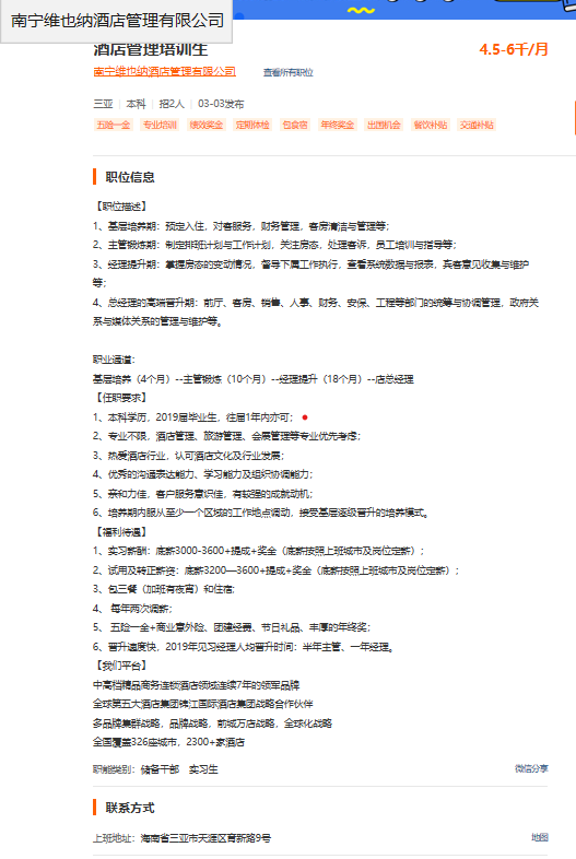 南宁维也纳酒店管理有限公司 酒店管理训练生