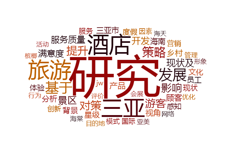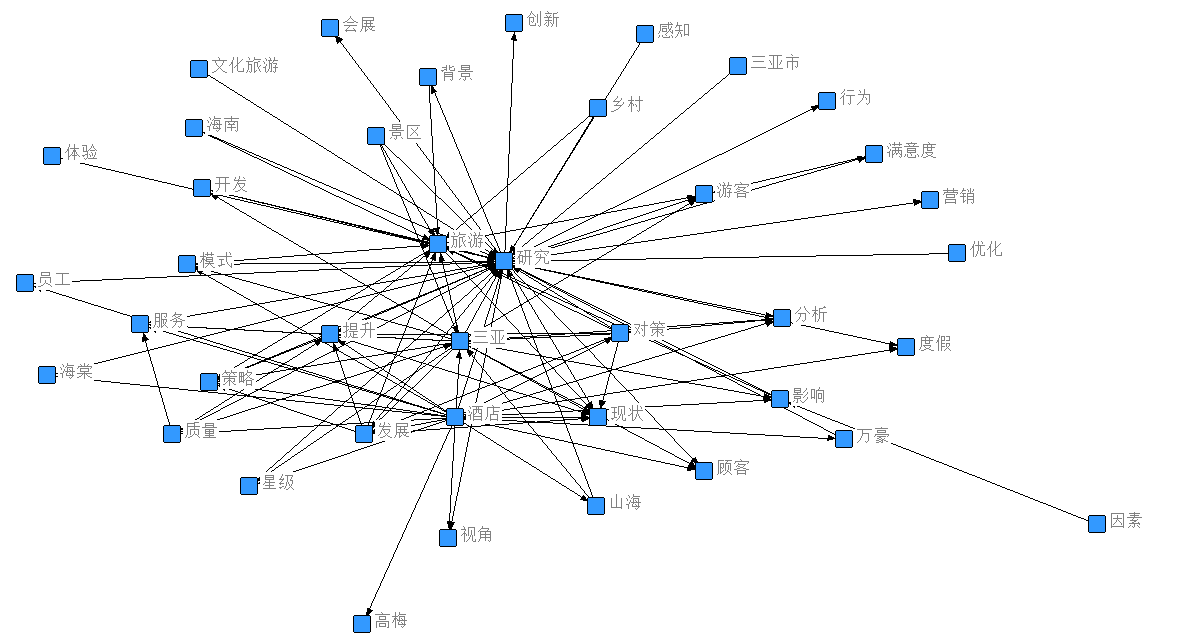 对2016级毕业生论文题目的语义网络分析发现,旅游与乡村、景区、开发、体验、文化旅游、游客等关键词相连较密切;酒店与星级、服务、质量、现状、视角、度假、三亚等相连;研究区域多以海南、三亚、海棠湾以及具体的酒店或景区展开。