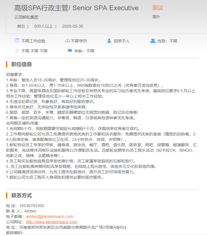 云顶邮轮集团高级SPA行政主管