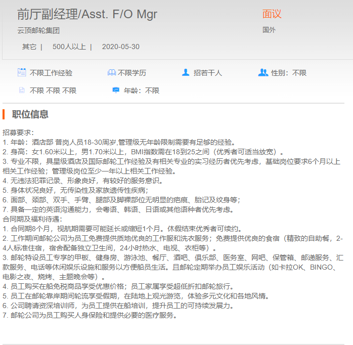 云顶邮轮集团前厅经理