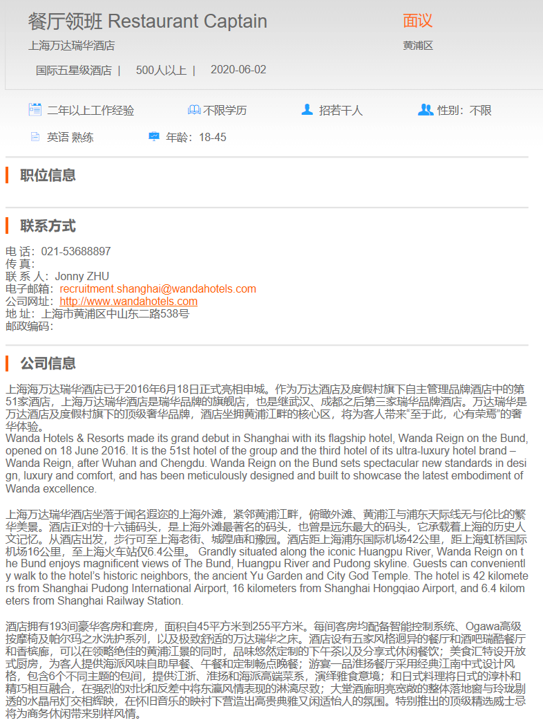 上海瑞华酒店 餐厅领班