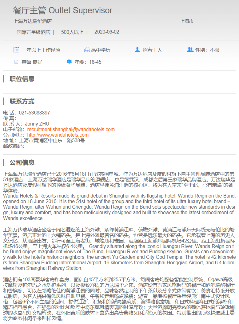 上海瑞华酒店 餐厅主管